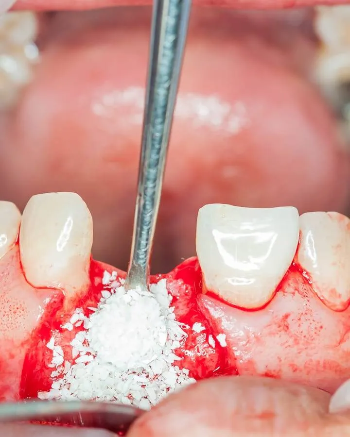 High-quality, biocompatible bone graft material is precisely placed into the empty socket. This material acts as a structural scaffold, signaling the body to grow new, healthy bone.